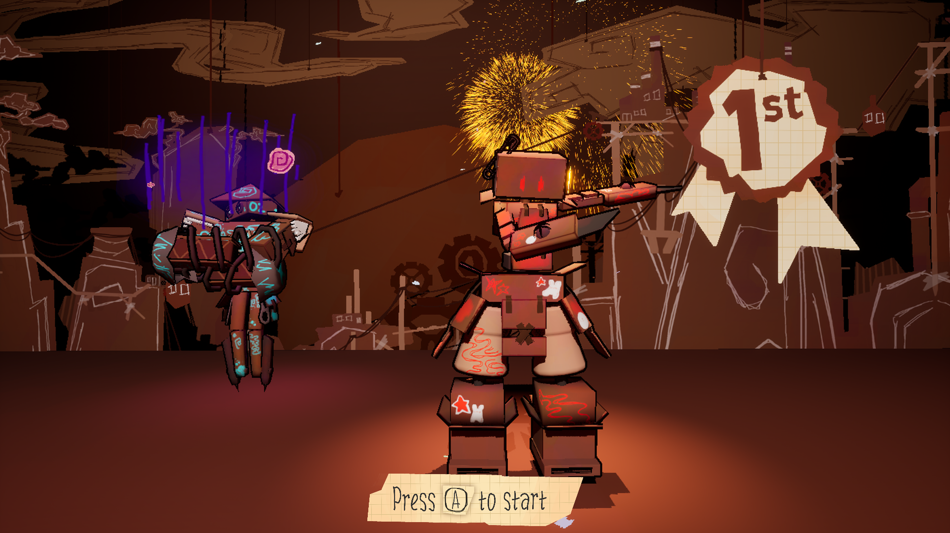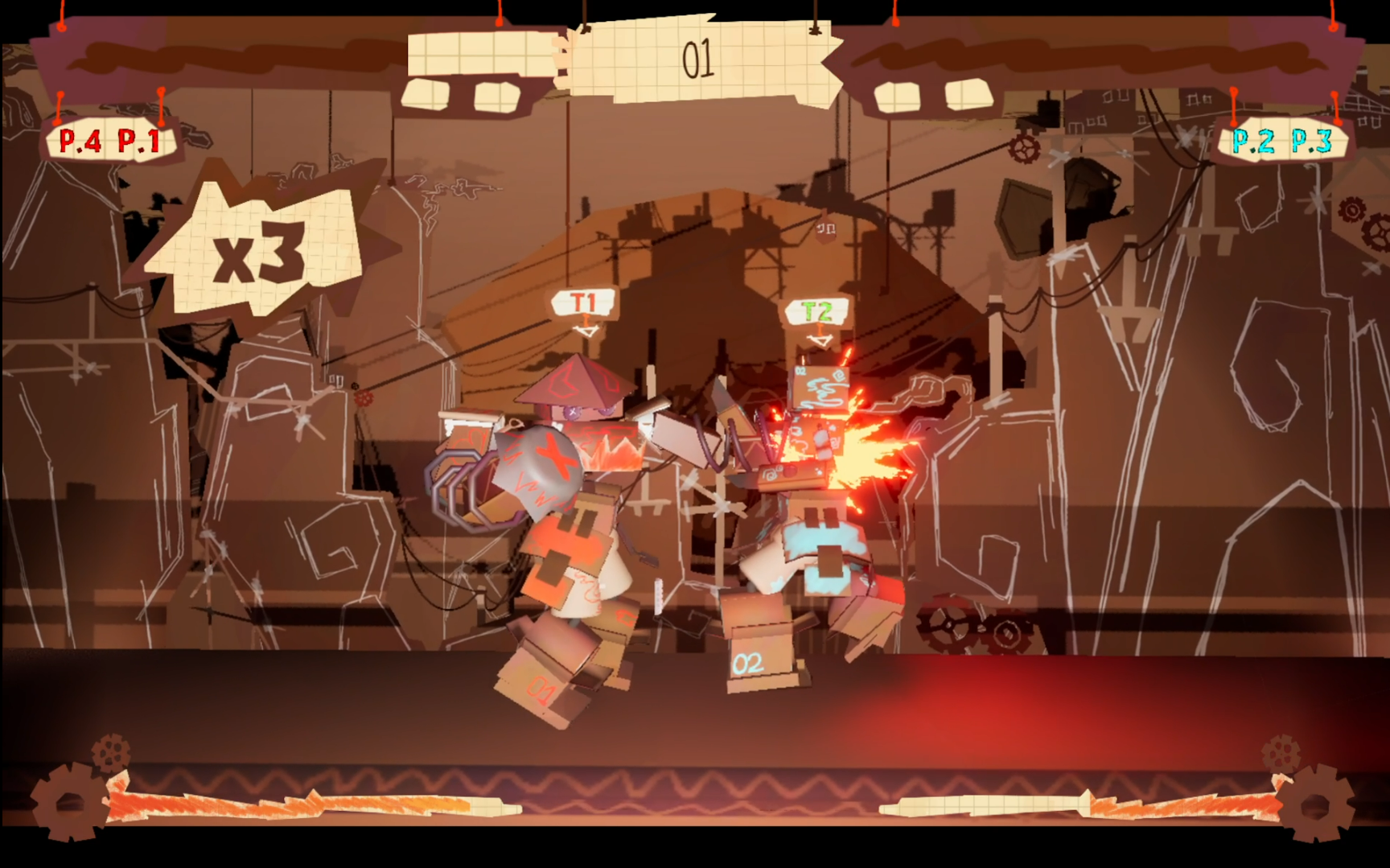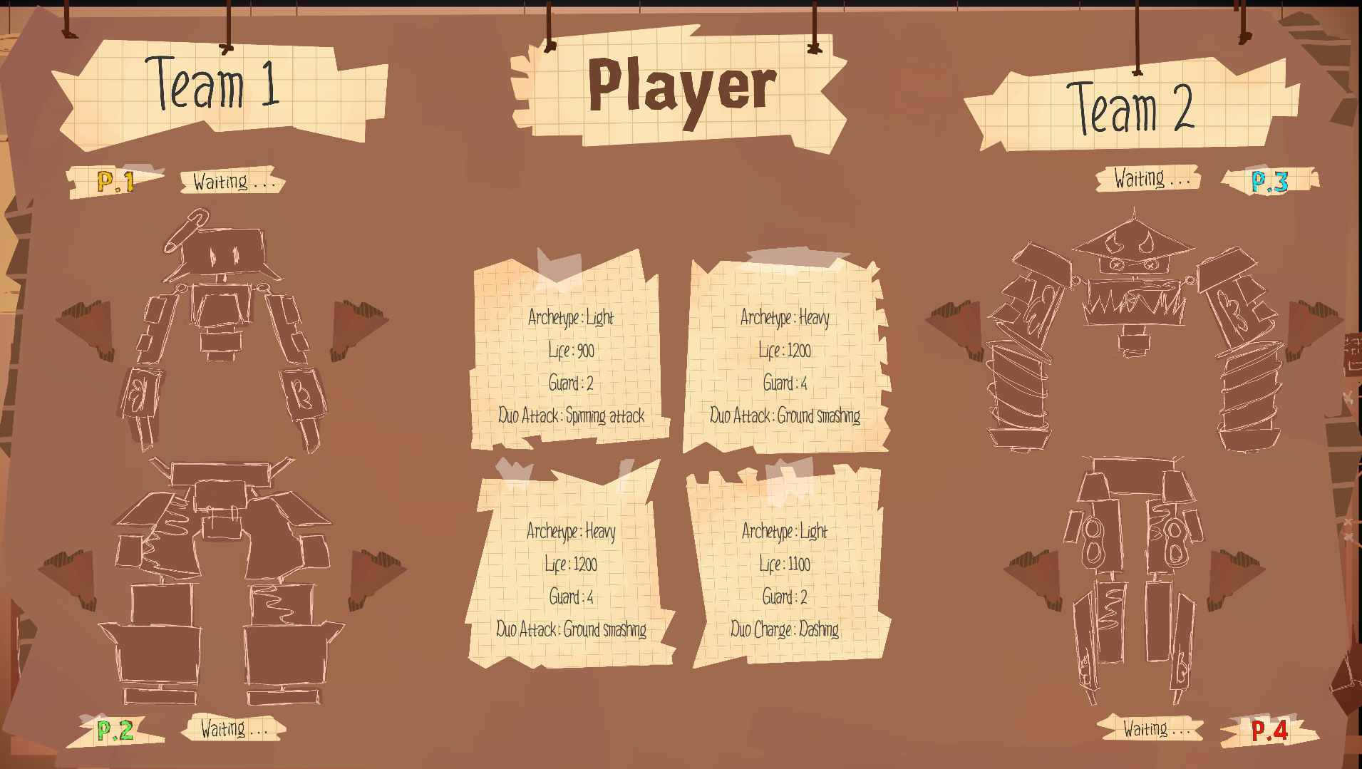 You embody little handmade robots built by a group of children who love robot battle shows. Not having enough cardboard to build more, they have to share a single fighter between two people. So, they have to team up if they want to enjoy some friendly competition !